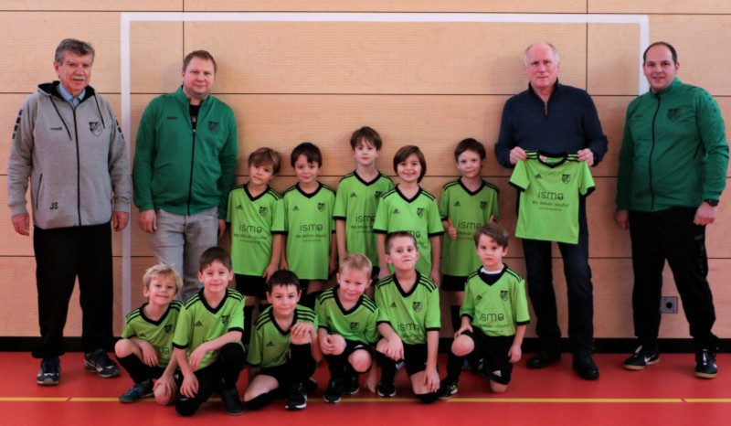 Die Jüngsten der DJK - die G-Junioren- bedanken sich für das Trikotsponsoring bei der Firma ISMO (Institut für system.Management und Organisation)mit Geschäftsführer Georg Rothut(2.v.r.).Der Jahrgang 2015 mit Trainer Jakob Scharf (li),Co-Trainer Bernhard Nicklas (re) und Betreuer Bernhard Müller freuten sich über diese Unterstützung