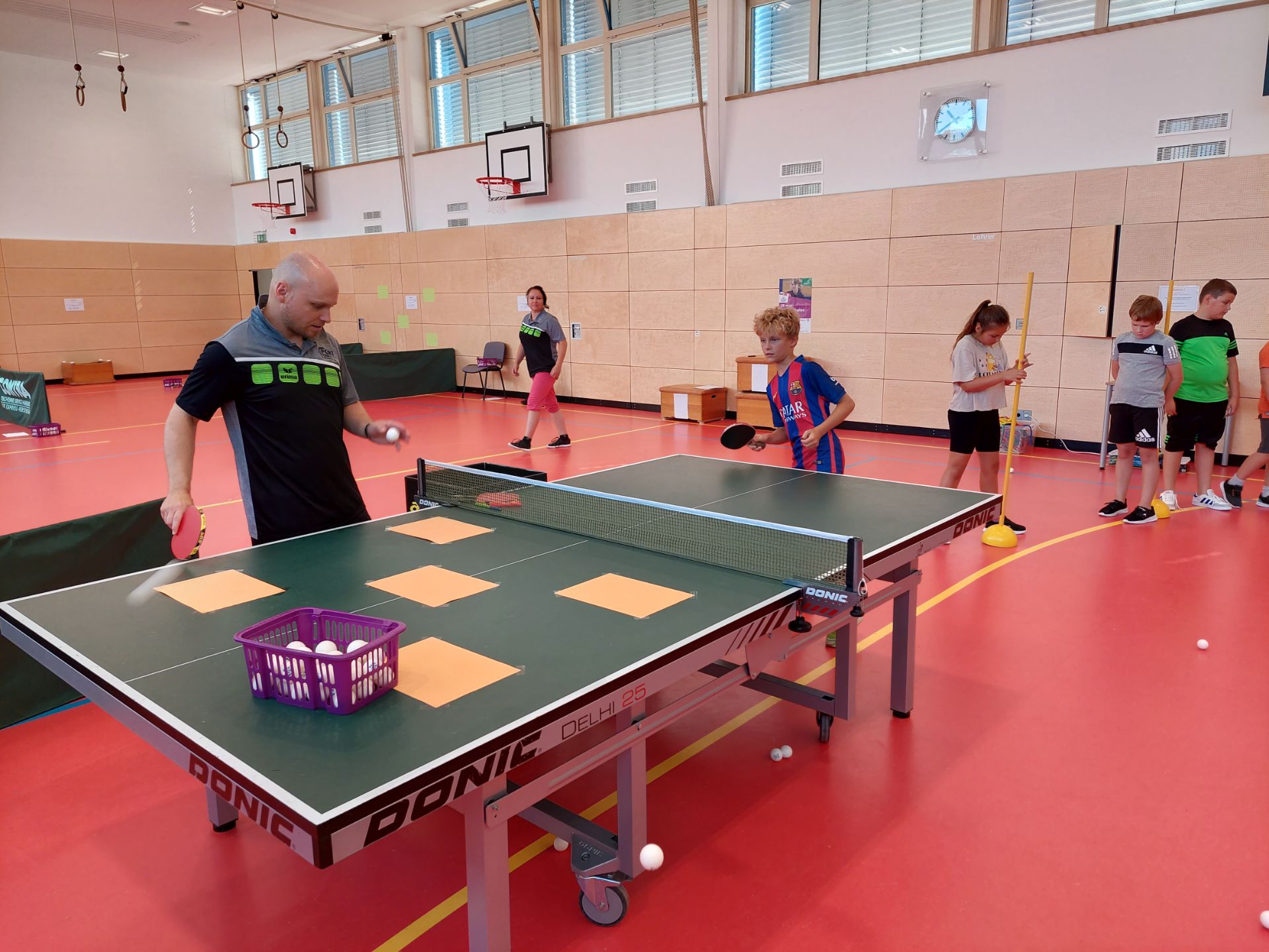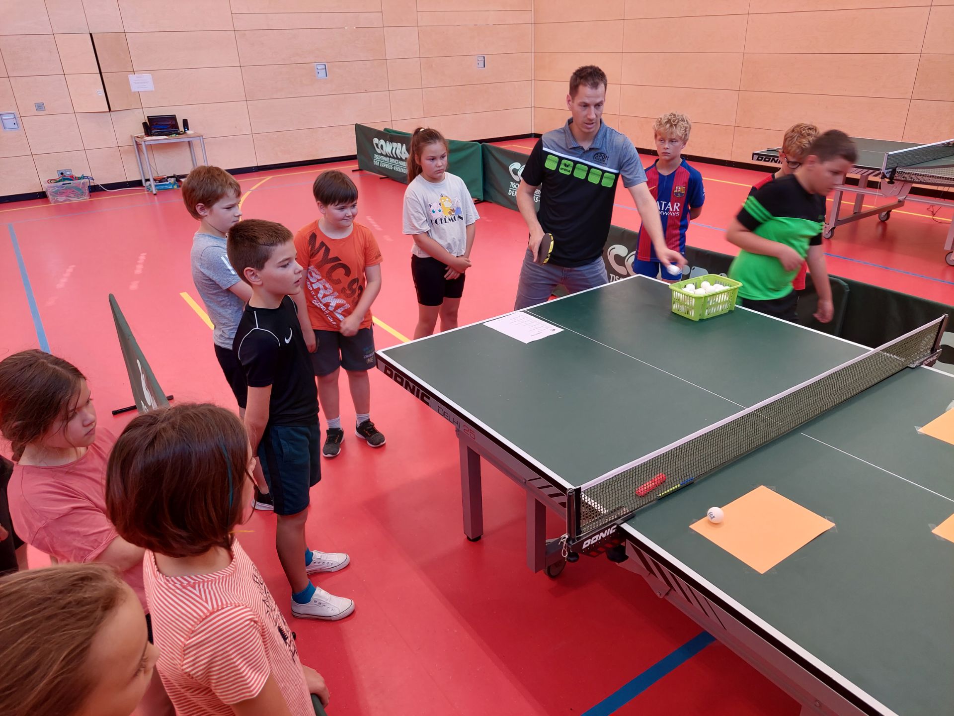 Am 22.07.2022 veranstaltete die Tischtennisabteilung der DJK SV Steinberg am See mit der ortsansässigen Grundschule Steinberg am See ein Tischtennisevent im Rahmen des Schulsports. In insgesamt vier Unterrichtsstunden konnten die Kinder der 1. bis 4. Klassen den Tischtennissport hautnah erleben und anfassen. Von einem lockeren Aufwärmprogramm, über zahlreiche abwechslungsreiche Tischtennisstationen, bis hin zu abschließenden konditionellen und kognitiven Spielen war alles geboten. Jedes Kind hatte hierbei einen Laufzettel erhalten und musste alle 7 Stationen durchlaufen und dabei fleißig Punkte sammeln. Die Kids mussten Slalomstangen umlaufen, Tischtennisbälle in Kisten versenken, Rotations- und Effetübungen spielen, Zielübungen an der Tischtennisplatte absolvieren oder aber aufgehängte Blätter an den Wänden treffen. Highlight war der unbesiegbare Tischtennisroboter, dem sich jedes Kind mal stellen durfte. Am Ende wurden alle Kinder prämiert und für Ihren Einsatz belohnt, denn neben jeder Menge Spaß wurde den Kindern auch einiges abverlangt. So einige Schweißtropfen sind dabei geflossen. Sehr positiv zu erwähnen ist die unkomplizierte Kooperation zwischen der Grundschule Steinberg am See und dem Verein, die dieses tolle Event schnell und einfach ermöglicht haben.