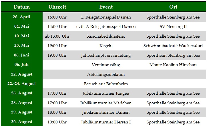 Die Steinberger Damen kämpfen am 26. April um 16:00 Uhr in heimischer Halle um den Aufstieg in die Landesliga. Zum 1. Relegationsspiel erwarten die Damen der DJK Steinberg am See den Zweitplatzierten der 1. Bezirksliga Mittelfranken TV Altdorf.